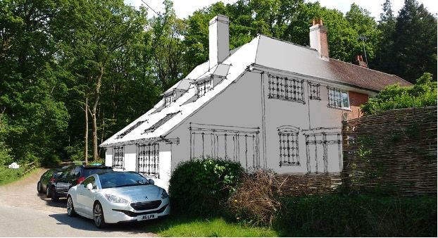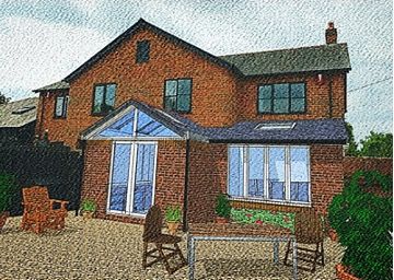 Illustrating a preliminary design exercise investigating how to improve the appearance of a dated house whilst providing additional space.