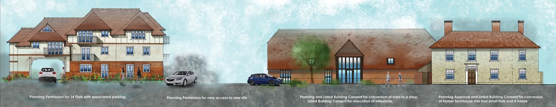 Planning Approval and Listed Building Consent for conversion of semi-derelict farmhouse, No.1 The Broadway (Chapel Street) into four small flats and a house.